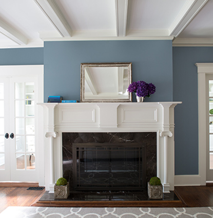 Here, a deep blue-gray living room is balanced with classic white architectural details.