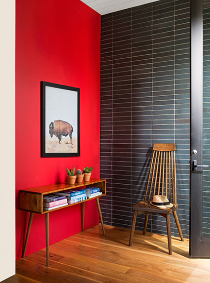 Treat your smaller spaces to some extra attention with red paint. From light-filled entryways to guest powder rooms to an intimate dining room, red sets a tone of elegance and style, bringing instant personality to smaller spaces throughout your home. Here, a red accent wall greets guests with a welcoming burst of energy.