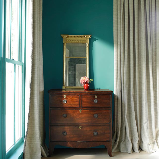 Κάτω απ’ την οροφή από ακατέργαστο ξύλο, το εντυπωσιακό γαλαζοπράσινο της Soft Spruce 671 επιδρά σημαντικά στην εμφάνιση αυτού του υπνοδωματίου. Έντονη και κομψή, αυτή η αφυπνιστική απόχρωση ισορροπεί τη βγαλμένη απ’ άλλη εποχή γοητεία αυτού του χώρου με τις κουρτίνες μουσελίνας, τη vintage συρταριέρα και τον καθρέφτη αντίκα. Ιδανικός συνδυασμός άνεσης και κομψότητας, ένα υπνοδωμάτιο σε Μεσογειακό στιλ αποπνέει τόσο ρομαντισμό, όσο και χαλάρωση.