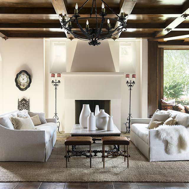 Σ’ αυτό το χώρο ανοιχτής διαρρύθμισης, η βαριά ξύλινη οροφή και οι εξαιρετικά καθαρές γραμμές αντανακλούν μια πιο κομψή πλευρά του Μεσογειακού καθιστικού, προσφέροντας παράλληλα θαλπωρή και άνεση. Το λευκό πάντα κάνει θαύματα στη Μεσογειακή διακόσμηση, όπως βλέπουμε και εδώ με την κρεμ Evening White OC-81 στους τοίχους.